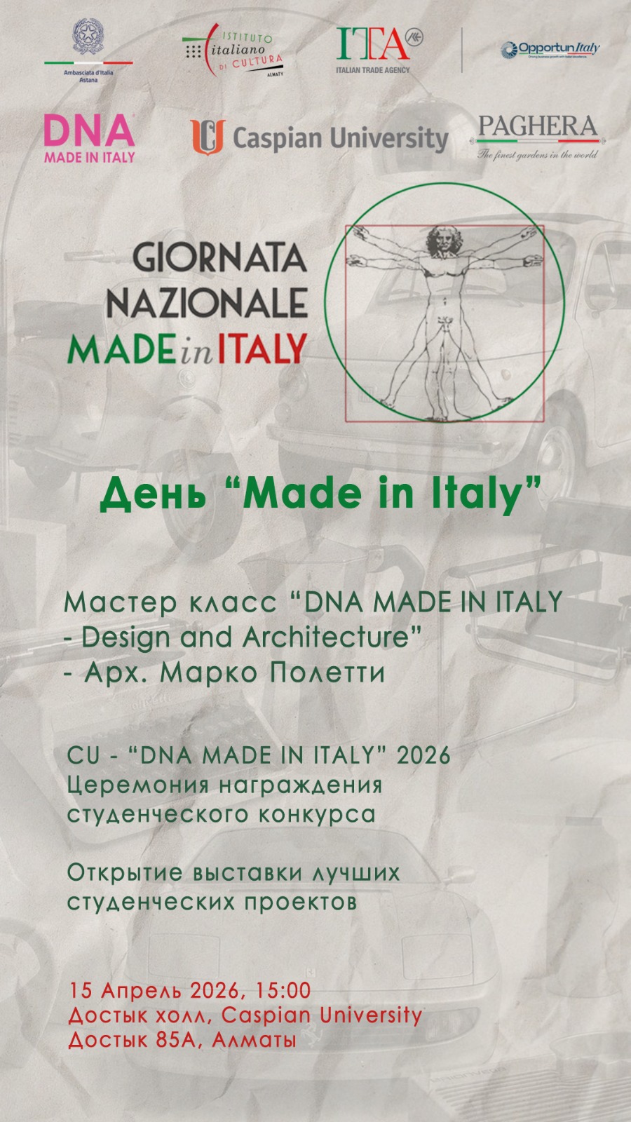 15 апреля 2026 года, в рамках Made in Italy Day, архитектор Марко Полетти (Милан) и профессор Джангабриэле Фини организуют студенческий конкурс и мастер-класс, которые пройдут в Caspian University в Алматы, при содействии д-ра Эдоардо Крисафулли, PhD, директора Итальянского института культуры в Алматы.